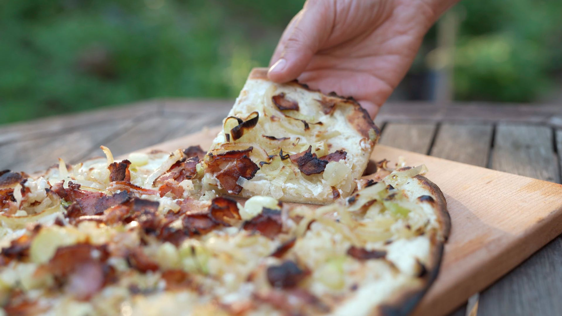Hand taking a slice of cooked flammkuchen with crème fraîche, bacon lardons and onions on a bamboo serving board.