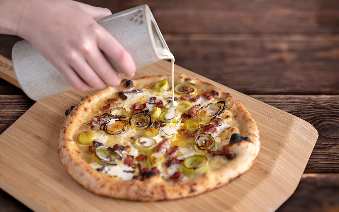 Drizzle your pizza base with fresh cream before and after cooking to make for a cheat’s Béchamel sauce. A signature white pizza recipe from Pizza Taste Tester Peggy Paul Casella, this Bacon, Leek & Cream Pizza puts your cast iron to good use for cooking up a pizza topping of crunchy bacon bits and sweet sautéed leek.
