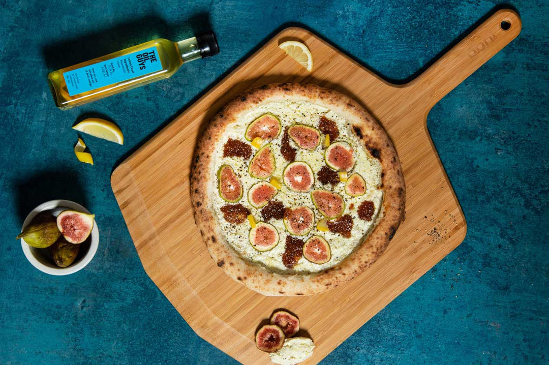 A delightfully salty and sweet pizza packed with the flavors of Greece. With a lemony feta cheese base, dollops of fig, mint and olive tapenade, fresh sliced fig and crushed walnuts – each slice is fit for the Gods!