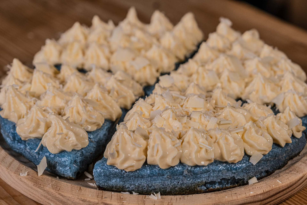 There’s nothing unnatural about the blue hue of the dough: it comes from spirulina, a blue-green algae that's been used as a food source for centuries, starting with the Aztec and Kanem civilizations. Today, it’s grown all over the world and is thought to have many health benefits such as promoting gut and heart health.
