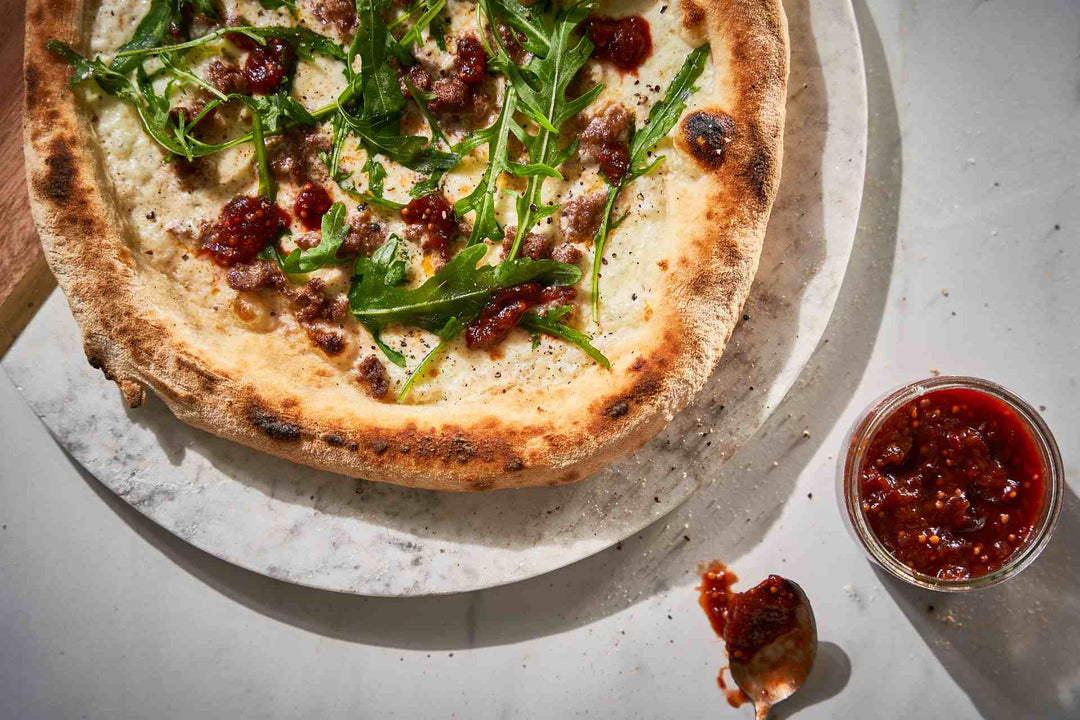 Bratwurst works especially well as a pizza topping as it’s neither too lean nor too rich. And when evenly spread over a mild mozzarella and ricotta base, you’ll get buttery, slightly crunchy bites that won't overwhelm the palate. The rhubarb chutney adds a zesty balance to the pizza, not to mention being a standout condiment for your next barbecue. After baking, the final touch is a handful of fresh, peppery arugula leaves, for a slightly nutty (and extremely mouthwatering) pie.