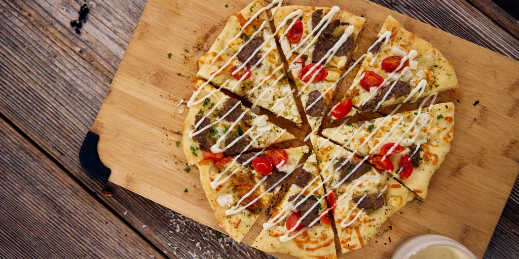Here, journalist, former line cook and one-time pizzaiola Ivy Knight (@ivyporkchopknight) marries the best of Canadian legends King of Donair and Nimrod’s versions to create this quintessential pie. A classic pizza dough base is topped with mozzarella, tomatoes, onions and thinly sliced donair meat (a mix of ground beef and lamb). For a savory twist, the crust is dusted with za’atar – a Middle Eastern spice mixture that includes thyme, marjoram, sumac and toasted sesame seeds – and the pie is drizzled with sweet donair sauce. Odd? Maybe a little. Delicious? Absolutely.