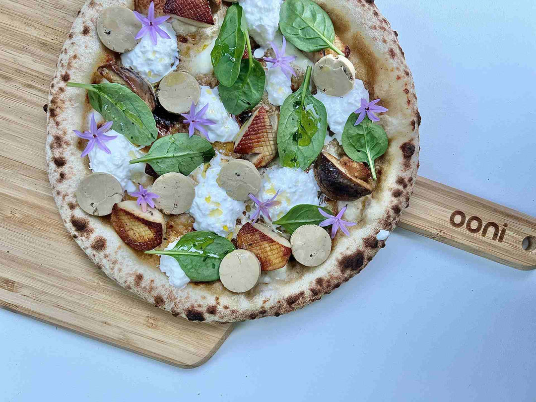 The pizza is then topped with tasty roasted porcini mushrooms, herbs, stracciatella, foie gras confit (foie gras seared in duck fat) and garlic flowers. It is the perfect pie for celebrating with friends, family and fellow gourmands!