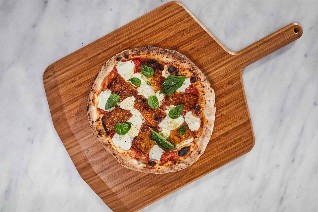 Thin, crispy golden fried pieces of eggplant, crushed tomatoes, ricotta and fresh mozzarella top a Neapolitan-style pizza crust for a deconstructed riff on an Italian dish that dates back to the 1700s. While eggplant parmesan is typically baked in an oven and served over pasta, our recipe takes all the elements of this classic dish and puts them on a pizza, paying homage to slices we’ve seen at pizza shops around the United States.
