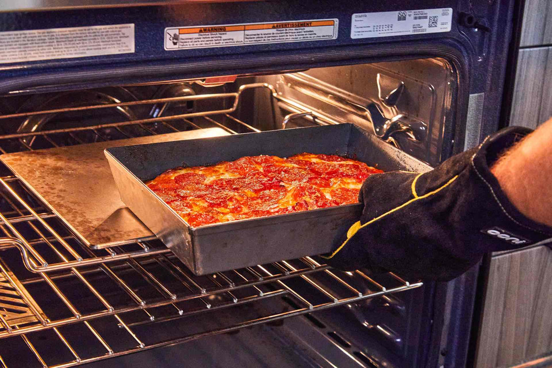 An Ooni Pizza Steel 13 is our trick to making a great Detroit-style pizza in your home oven. The pre-heated Steel gives the bottom of this pan pizza an impressively-browned crust, keeps the edges of the pizza wonderfully cheesy and the sauce bubbly and delicious.
