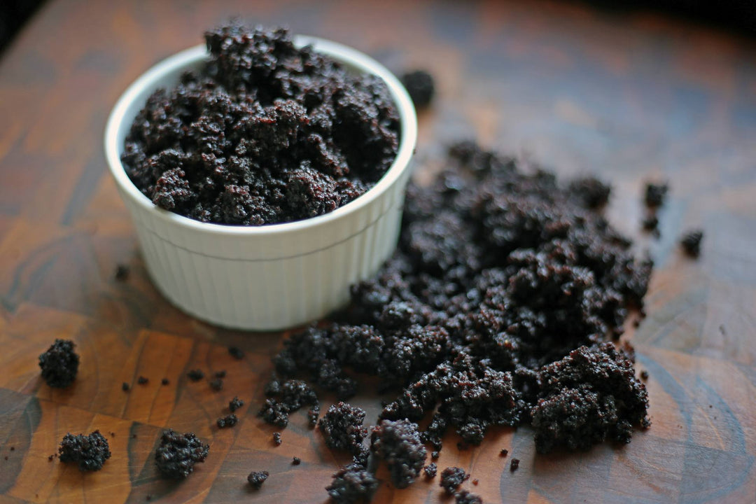The crumbs in this recipe come from devil’s food cake, a moist, rich chocolate layer cake known for being airy and light. The recipe was developed as a component for a Brooklyn Blackout Dessert Pizza featuring a cocoa dough, and it taps into some of our favorite approaches used by Epicurious and Smitten Kitchen. In addition to combining some of our favorite elements of these and other recipes, we substituted sour cream for buttermilk and used extra-virgin olive oil instead of vegetable oil for a savory finish more redolent ofh pizza.