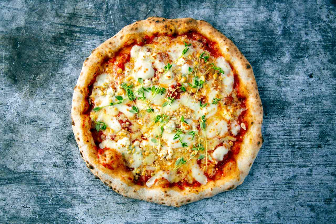 Cheese, cheese and more cheese! This deliciously gooey four cheese pizza (AKA the quattro formaggi) is topped with sharp cheddar, creamy mozzarella, pungent blue cheese and tangy feta for a cheese lover’s dream.