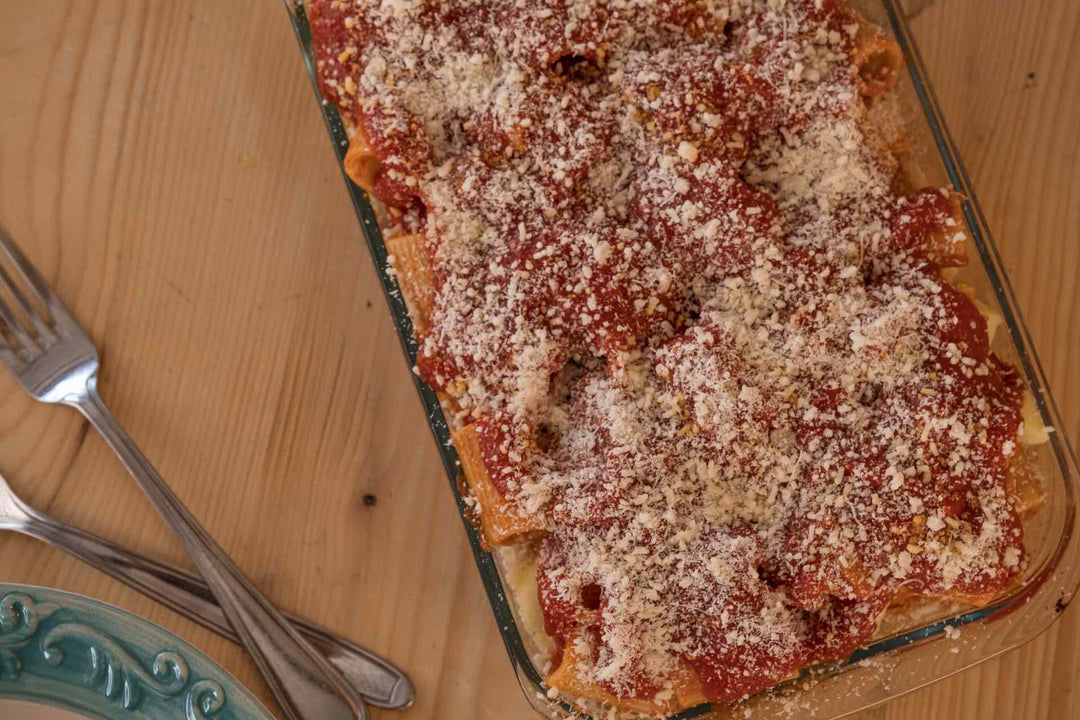 One of the advantages of this baked pasta is that it can be prepared early and cooked later, which means less time spent in the kitchen and more time with dinner guests. And while the ingredients here are classic Italian offerings, you can experiment with infinite variations – more veggie forward, for example – or as a means to clear out the fridge.