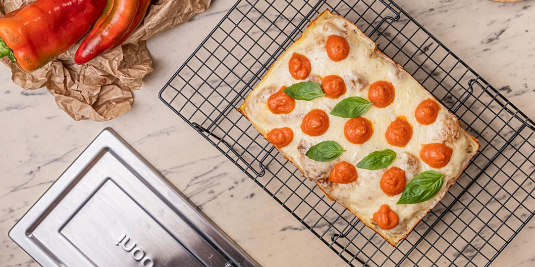 Detroit-style pizza (DSP) has been on the scene since its inception back in the 1940s with its distinctive shape, thick, fluffy base and crispy, golden cheese “frico” crust (for more about this style and other pan pizzas, read more here). At Ooni, we’re such huge fans that we created our own Detroit-style Pizza Pan, blending traditional design with modern technology to make these authentic and delicious pies at home. We also enlisted chefs, authors and pizzaioli from around the globe to put their own distinct spin on this classic. What would a DSP look like if it had originated in Scandinavia, France, Italy, the UK or beyond? We aimed to find out. Each offering is a creative, tasty rendition of this American pizza powerhouse.