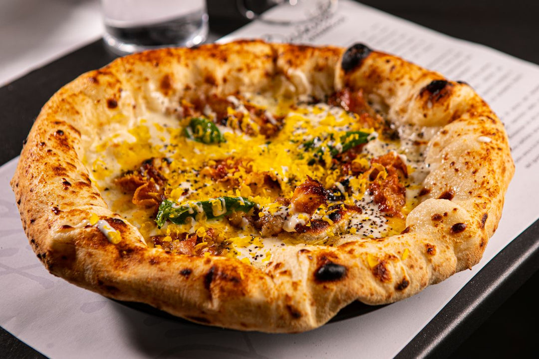 Marco’s Carbonara Pizza is an ode to Rome and the signature flavor and textures of one of its most famous dishes, and using high-quality ingredients is absolutely fundamental. He prefers guanciale from the Lucania region of Italy (sourced from wild pigs), fresh buffalo mozzarella and Pecorino Romano, and, of course, fresh eggs. Taking it a step further, Marco puts the eggs through a special marinating process that includes mixing the yolk with sugar and salt and letting the mixture rest for two or three days (depending on the size of the eggs used). He then grates the final product over the pizza. As for the distinctive peppery bite, Marco prefers Cuvée pepper, a blend of ground spices, Tasmanian mountain pepper and cubeb pepper.