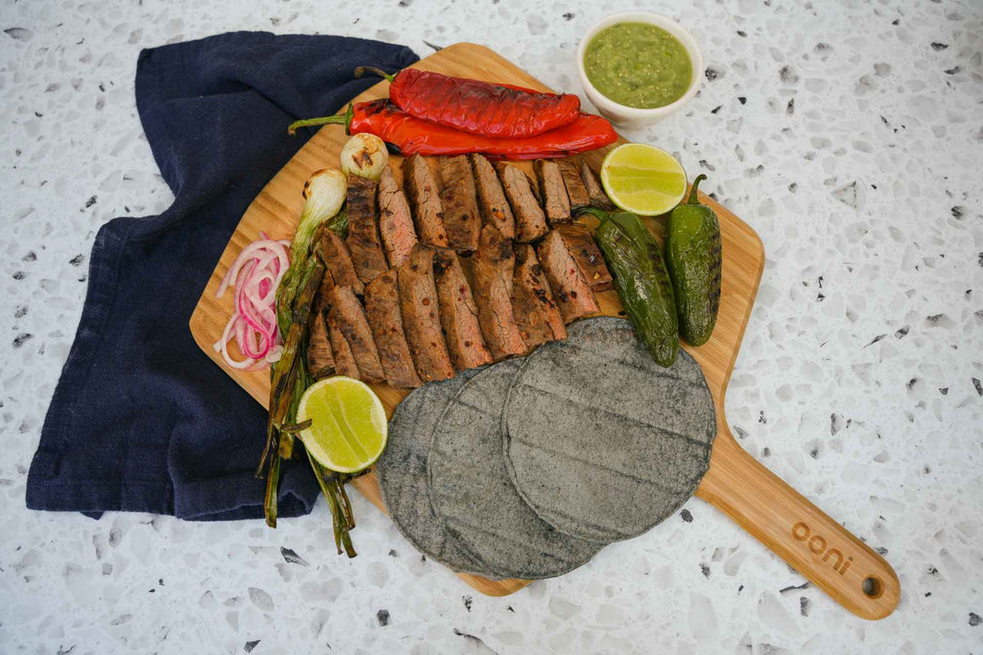 You can cook and reheat your tortillas in the Ooni – once you do, you’ll understand why Masienda found this to be the fastest and most effective method for whipping up carne asada tacos yet. In fact, every element of these tacos can be made in an Ooni: blistering the ingredients for the salsa verde (which can then be blended or hand-ground in a molcajete, the traditional method that yields impressive flavor and texture) and grilling the meat.