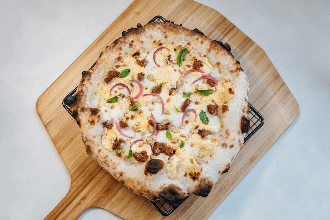 Sweet, spicy and packed with big flavors, this pizza from Ooni Ambassador Jonathon Schuhrke (@santabarbarabaker) combines merguez, the fragrant North African lamb sausage, with creamy whipped feta cheese spiked with apricot preserves. Homemade quick-pickled red onions, toasted pine nuts and fresh mint combine to deliver a pizza that hits all the senses.