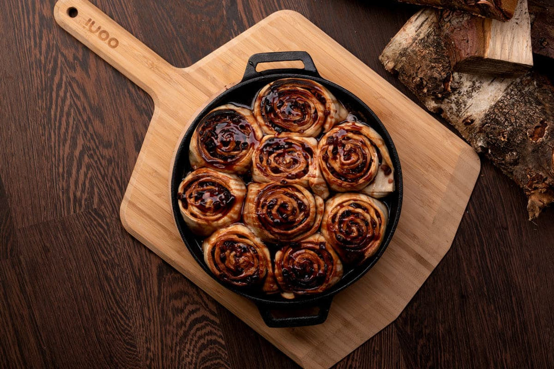 Place the skillet inside your Ooni. Position it as close as possible to the opening and bake the ring for about 20 minutes, or until the rolls are puffed up and golden. Extinguish the flame in your Ooni and leave the rolls to continue cooking slowly in the residual heat of the oven. Once cooked, remove the skillet from the oven and allow to cool for 5 minutes – be careful when handling as the syrup on the bottom of the rolls will be extremely hot.