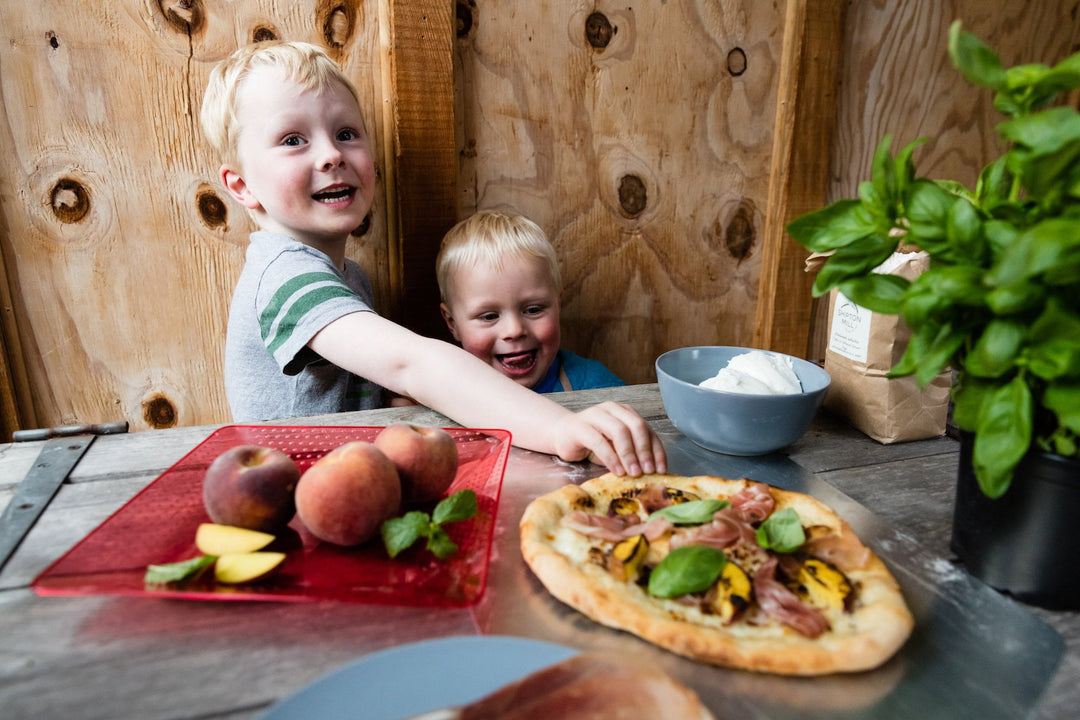 Using a small amount of flour, dust your Ooni pizza peels. Stretch the pizza dough ball out to 12”/16” and lay it out on your pizza peel. Brush the pizza base with the garlic oil mixture, and top with the peach, mozzarella and prosciutto.