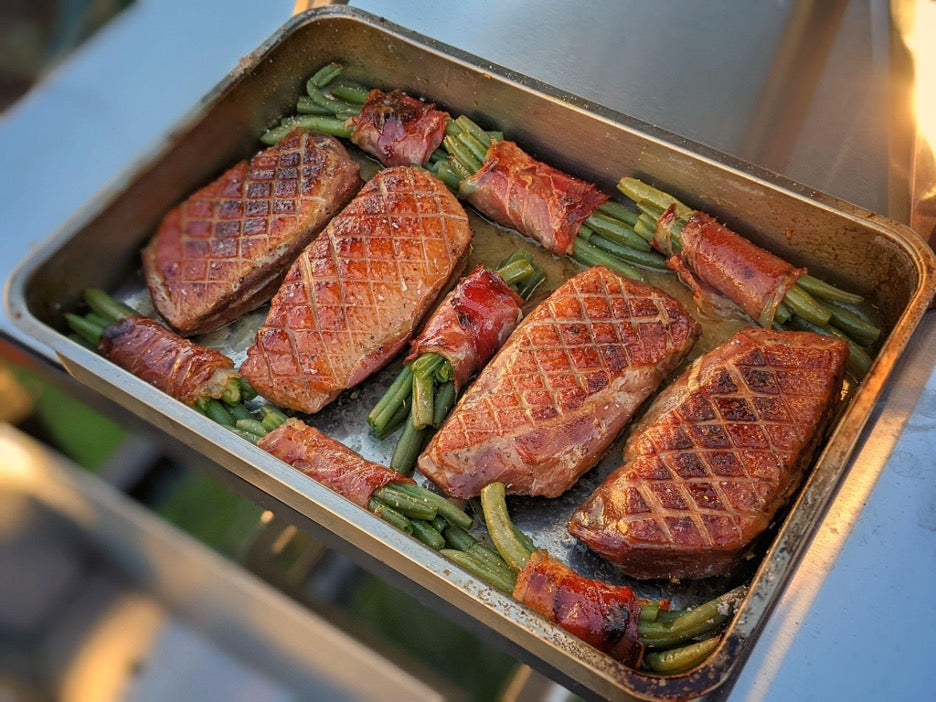For a flame-cooked twist on Entenbrust mit Knödel, a classic German dish of duck breast with dumplings, this recipe from Bavarian grilling enthusiast Dominic Stettner is one to try. Using fresh, high-quality ingredients will make the standout flavors of this dish pop — from fresh asparagus spears to succulent, organic duck breasts. The bacon-wrapped green beans add a salty kick to the tender duck breasts, which are served with an earthy root vegetable sauce that's heated with butter for a velvety finish.