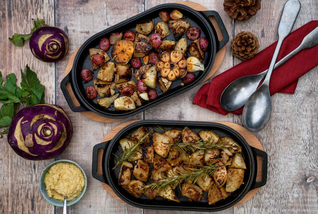 Once cooked through, remove the pan and transfer the hot contents to a covered serving dish to keep warm. (If you have two cast iron pans, you can cook the next batch in a fresh pan without needing to transfer.) Place the empty pan back in the oven to heat for 5 minutes before adding the garlic radish kohlrabi mix.
