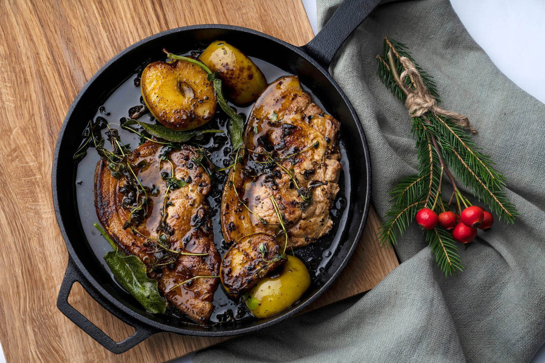Thick, juicy pork chops grill up perfectly in Ooni’s cast iron Skillet, paired with tart roast apple wedges and a touch of cinnamon.