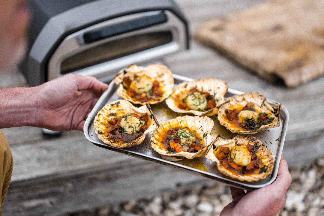 Because scallops do well when cooked quickly and at a high temperature, using an Ooni makes total sense – the oven floor transfers heat directly into the shells, which cooks the scallop meat from underneath while the rolling flames sear them from above. They take no more than a minute or so and take on a gorgeous smoky flavor.