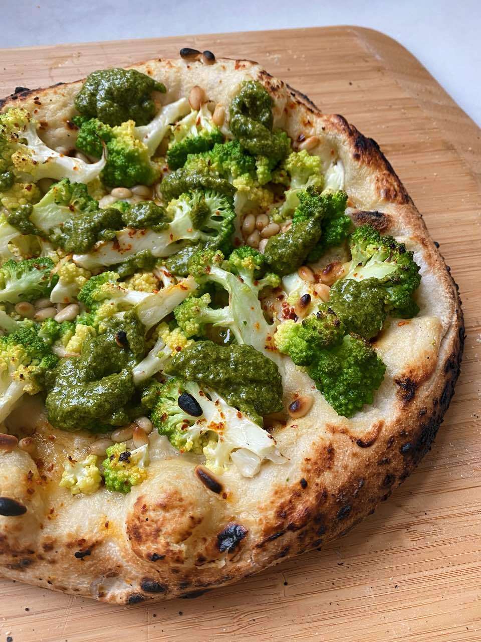 This superfood recipe from UK-based chef, Waitrose Weekend columnist and Sunday Times best-selling author Elly Curshen pairs a herby Mediterranean salsa verde and roasted romanesco with a homemade cashew cream for a unique pizza that also happens to be vegan.