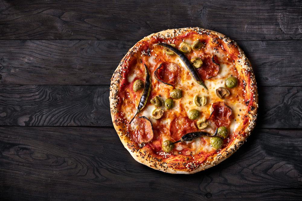 Using a small amount of flour, dust your Ooni pizza peel. Stretch the pizza dough ball out to 12"/16" and lay it out on your pizza peel. Drizzle the honey over the very edge of the pizza crust, and sprinkle the sesame seeds on top. Using a large spoon or ladle, spread the pizza sauce evenly across the center of the pizza dough base. Top with the mozzarella, salami, olives and chillies.