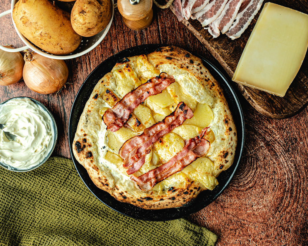 While the exact toppings can vary, typical ingredients often include Beaufort (a semi-firm, cow's milk cheese with a rich and nutty flavor from Savoy), smoked bacon or lardons, sliced potatoes and caramelized onions, all on a base of smooth and tangy crème fraîche.