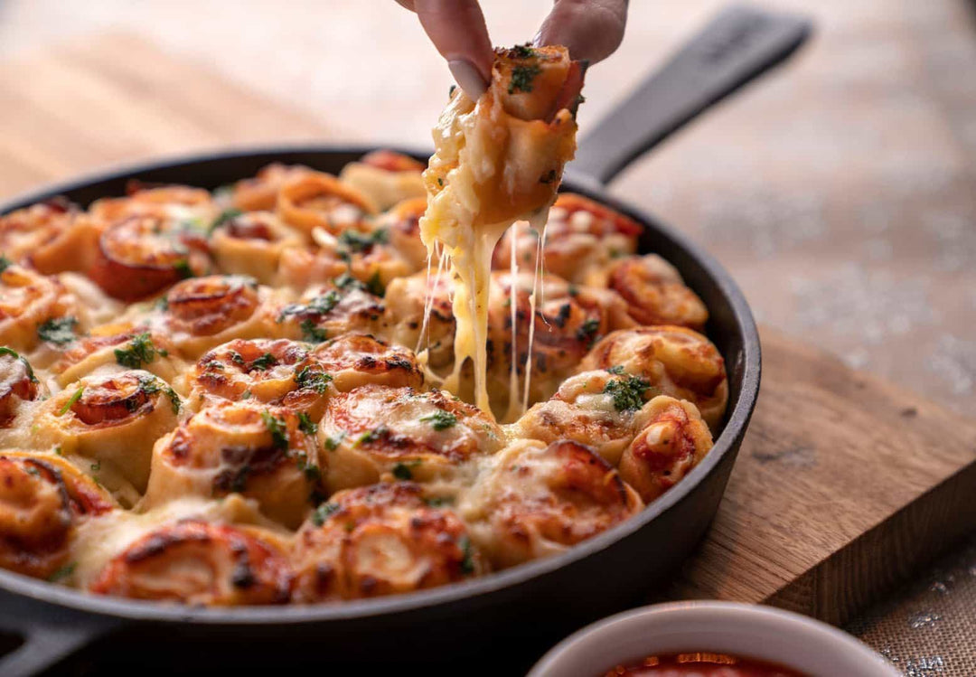 Stuff it, roll it, bake it. Sharing is caring when it comes to our crowd-pleasing Skillet Baked Pizza Rolls – layer pizza dough with gooey mozzarella and chopped pepperoni, smother with melted herb butter and tuck them into Ooni’s cast iron Skillet. This party snack is guaranteed to be the hit of the night among your guests!
