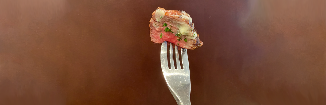 A piece of sous vide steak on a fork. Made in an Ooni using a sous vide steak recipe.