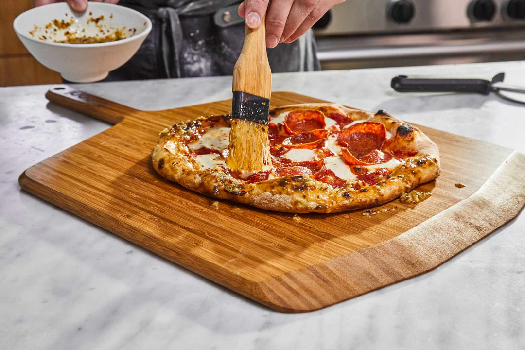 For our Supercharged Pizza Crust we’ve nitro-boosted the garlic flavor, swapping powder out for finely chopped fresh garlic. We’ve also added dried oregano and red pepper flakes for herby notes and playful spice. The result is a power-packed punch of flavor — delicious enough to make you feel like you’re saving the best bites for last.