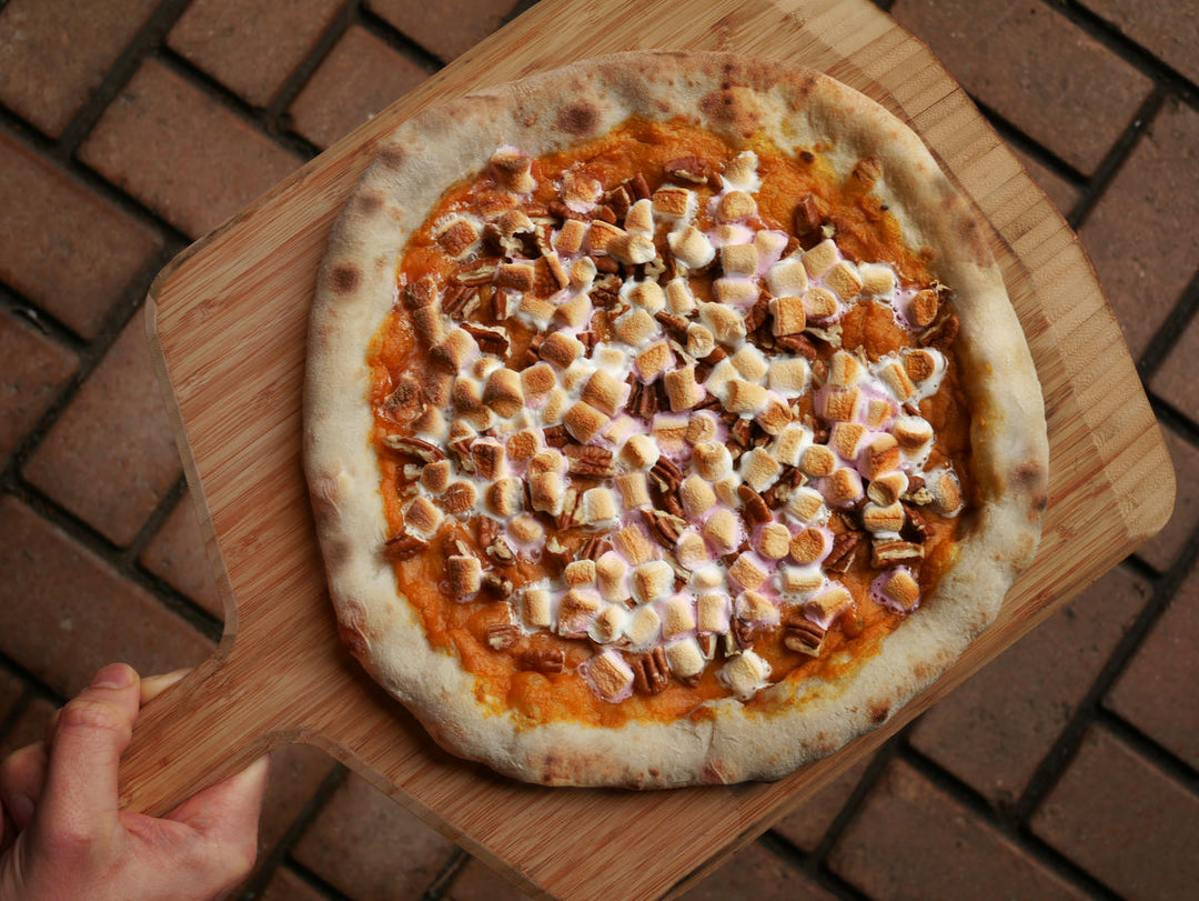 All the best flavors of this Thanksgiving classic, served atop a perfect pizza base. Soft sweet potatoes are blended with spice, sugar and butter to create a creamy, nutty base. Partially cooked, it’s then topped with crunchy pecans and pillowy marshmallows, toasted to perfection in a final blaze of heat.