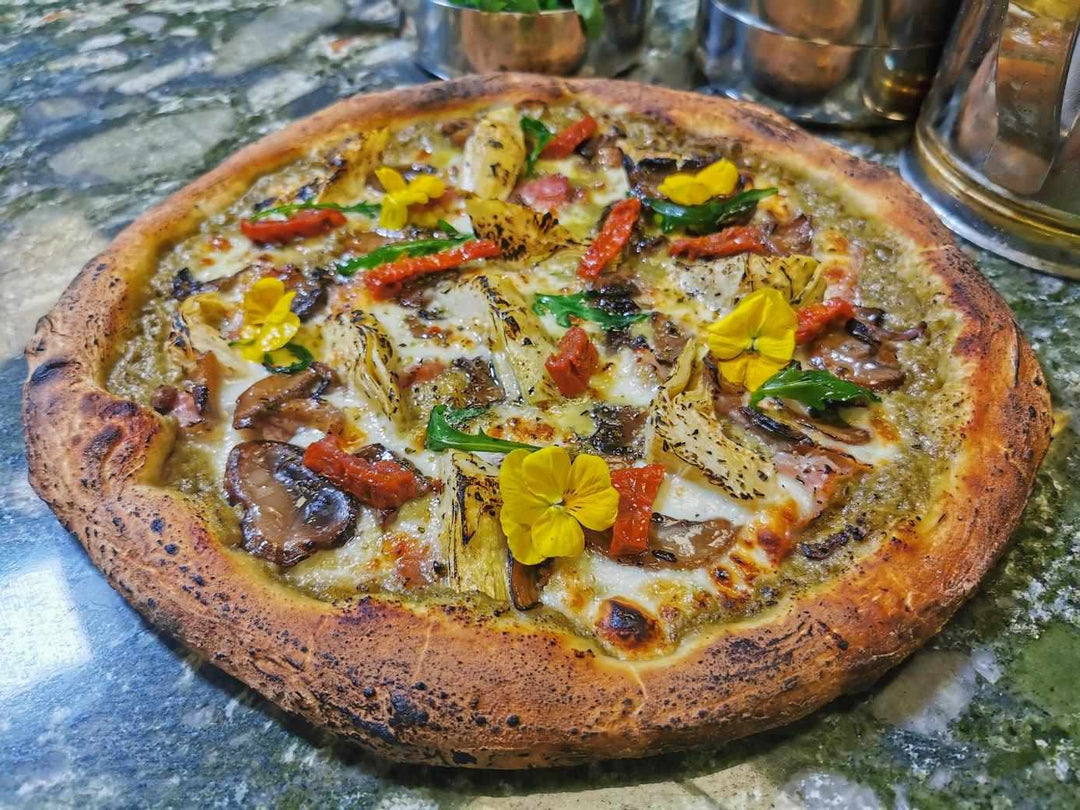 If you want something creative and colorful to make on your next pizza night, try this veggie-forward French- and Italian- inspired offering from French chef Thierry Graffagnino. As a three-time Pizza World Cup champion and passionate pizza instructor for more than 45 years, he combined typical ingredients from both countries—mushrooms for France, artichokes and mozzarella for Italy—and topped them with bright, edible flowers. While Thierry has been in the pizza game for several years and honors traditional ingredients and methods, he’s passionate about innovation; with one of his more recent roles being a coach and recipe developer for Pazzi, a restaurant in Paris that utilizes robots to prepare super fast and affordable pizzas.